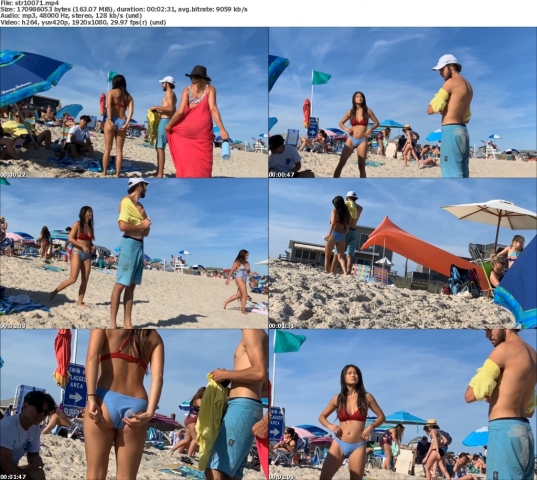 座っている状態から立ち上がると、ビキニのパンツがお尻の谷間に食い込んでしまって、よほど気になったのか、両手でパンツを引っ張って直しています。