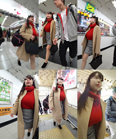 コートを着てても目立ちまくる爆乳なので声を掛けられるのも慣れているようで、軽くあしらうJD。そのあとはラッキーにも階段の上アングルをゲット。しかし時刻表を見た途端走り出します。焦った私も並走し、ここで衝撃のバルンバルンをゲット。厚かましく隣の席に座りました。