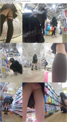 店内をでたJKちゃんを追い撮りで追跡。ここでは人があまりいなかったので、近づき過ぎず次のチャンスを狙います。すると雑貨屋に入るJKちゃん。ここでもヒット&アウェー中心をにピンクのPを頂いていきますが、ある場所で屈んで商品を手に取るJKちゃんのスカートの中にガッツリカメラをインします。