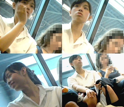 駅ホームでJKちゃんの短いスカートの中をじっくり撮影し、さらにそのまま2人と一緒に電車に乗り込みます。